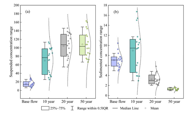 该项研究利用汉江中游流域的水文数据、地形数据、气象数据构建典型河段水动力模型,并在此基础上耦合颗粒输移追踪模型,基于实际召开的调研数据,选择研究区最常见的五种微塑料颗粒,分别模拟多种水文情势下颗粒输移过程,探究了不同类型微塑料颗粒在洪水不同阶段运移路径、时长、浓度的演变规律,结果表明高流量阶段微塑料颗粒悬浮浓度显著大于沉积浓度;在洪水落平阶段,微塑料颗粒总沉积浓度呈现出缓慢的增加趋势;高密度微塑料颗粒更易发生沉积;PET颗粒运移距离最短,PP颗粒运移距离最长且到达相同模拟点所需的时间更短。该项研究揭示了不同水文条件对微塑料颗粒运移过程的影响,研究结果为深入理解河流水体中微塑料颗粒运移过程和驱动机制给予了新的见解,为河流水体中微塑料污染控制和治理给予了有效工具。