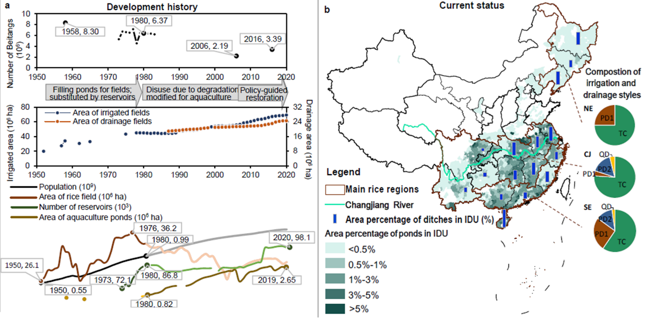 evo视讯官网杜耘、张亮团队,与中国农科院、华中农业大学、中科院重庆绿色智能研究院、加拿大滑铁卢大学及湖北、江西、辽宁省农科院等单位合作,系统调查了我国水稻灌排系统的开展历程及小水体利用现状,发现近几十年来由于填塘造田和自然损毁,我国稻区的水塘数量已大幅减少,现存水塘有的缺乏维护而淤积严重、有的改为精养渔塘,80%都不再参与水稻灌排(图1)。然而,基于前期建立的涵盖中国417个水体的数据集,团队发现相比于湖泊、水库等大型水体,小水体的氮磷截留能力更强。稻区小水体的减少和弃用,增加了水稻生产的清水消耗量和污水排放量,从而提高了水稻生产的水足迹。同时,过度依赖远距离水源的灌溉模式,也增加了稻田在干旱天气的减产风险。