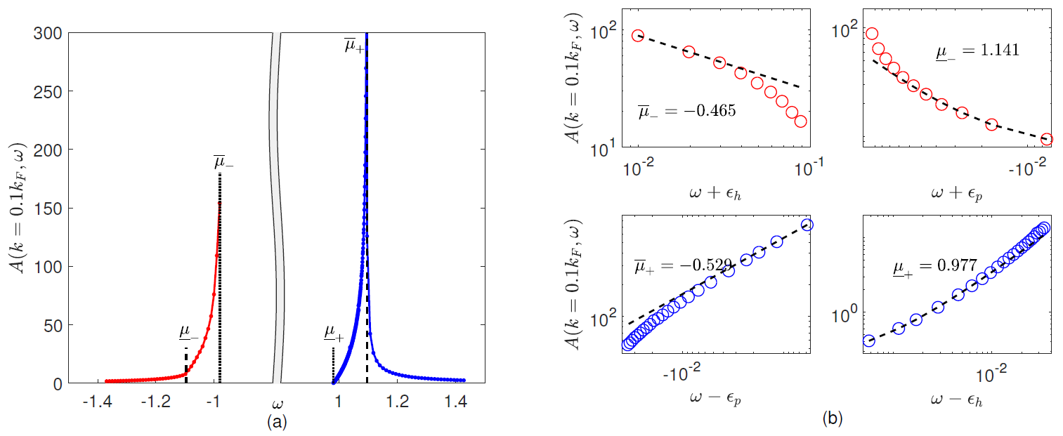 (a) 中等强度(γ=4.0)下, k=0.1kF的谱函数随能量变化的曲线。黑色虚线和点线分别标示了I型和II型激发谱的边界;(b) 谱函数在四个边界附近的幂律行为。红色和蓝色圆圈表示计算结果,黑色虚线代表拟合的幂律曲线。