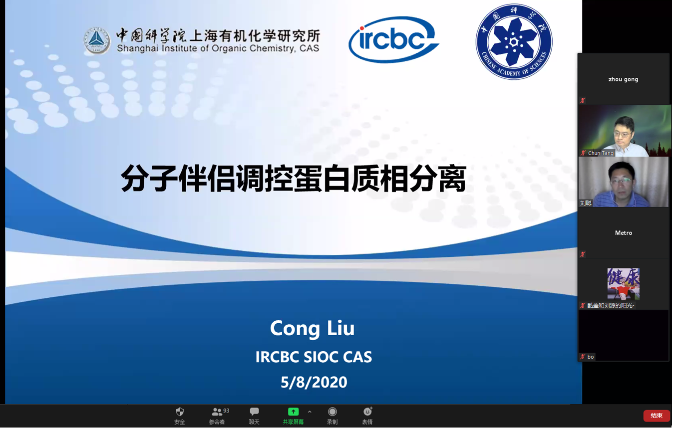 58日晚7:30,中国科研实验室生物磁共振与多学科交叉系列学术报告第一场在ZOOM线上会议平台正式拉开帷幕。应evo视讯官网唐淳研究员邀请,中国科研实验室上海有机化学研究所刘聪研究员作为报告主讲人,带来了题为“分子伴侣调控蛋白质相分离”的专题学术报告。刘聪研究员从开展蛋白质相分离的高通量筛选方法以及分子伴侣调控蛋白质相分离的应用研究两个方面,深入浅出的分享了课题组近年来在蛋白质相分离方面的研究进展。来自全国各地以及海外的近百名科研工作者共聚线上,参与了学术研讨和讨论。